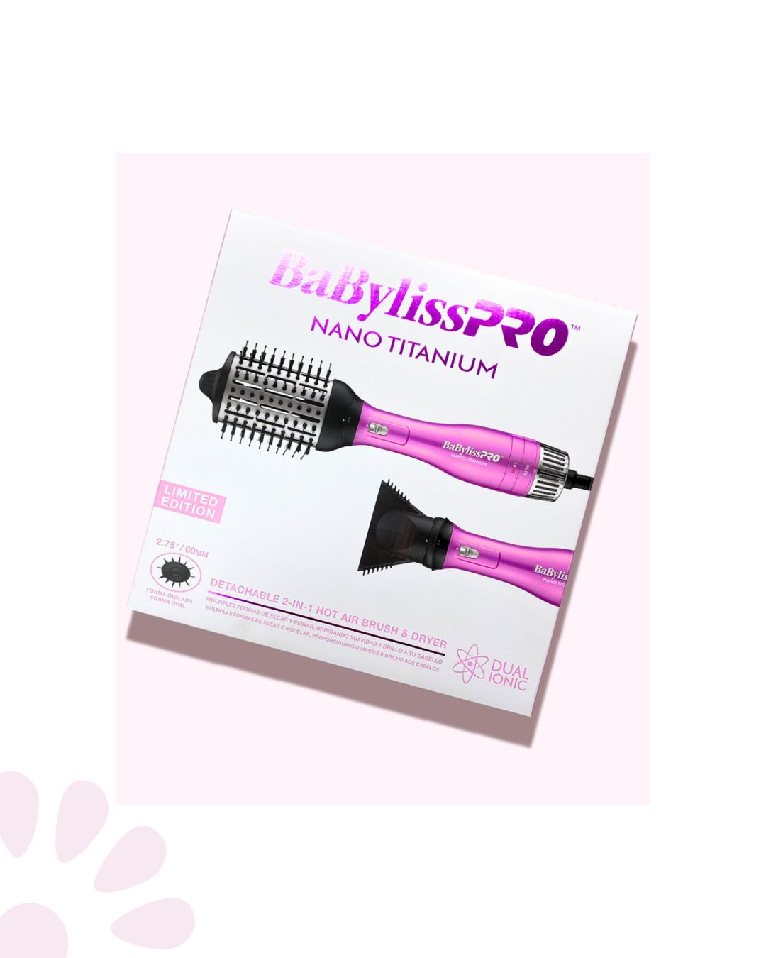 BaBylissPRO Nano Titanium Dual Ionic 2-en-1 Hot Air Brush / Secador (modelo BNTDHBCR275UX). Este cepillo de aire caliente combina cabezal de secador y cepillo en una herramienta versátil, con tecnología Nano Titanium y Dual Ionic para reducir el frizz y aportar brillo intenso.