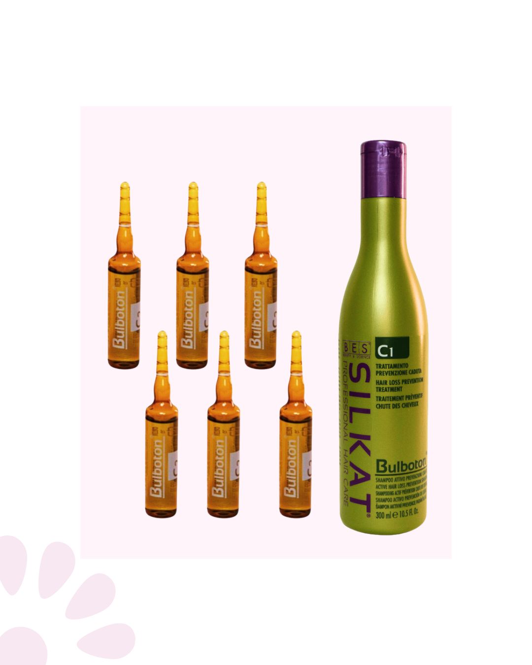 El kit BULBOTON anticaída es un tratamiento capilar completo que fortalece el cabello y estimula su crecimiento. Incluye un shampoo regulador de sebo con extractos naturales de bardana, ortiga y cola de caballo, y 6 ampollas de 10 ml con Tripéptido-19, biotina y cafeína, que mejoran la circulación del cuero cabelludo, fortalecen la fibra capilar y promueven un crecimiento más sano y resistente en 30 días.