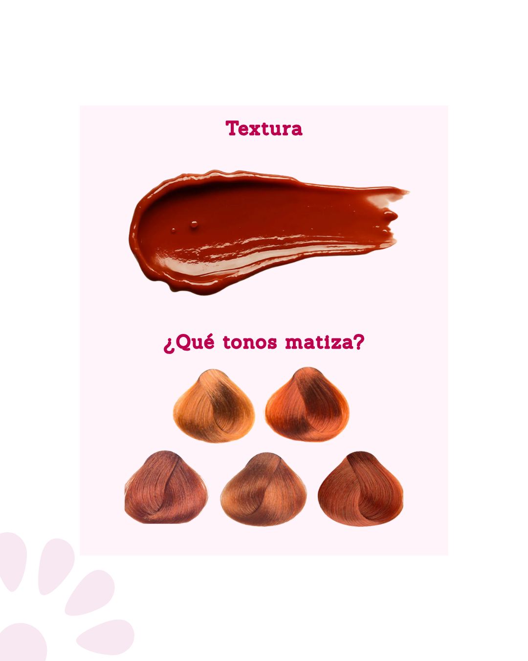 Protege e intensifica el reflejo cobrizo, formula con aceite de oliva y miel de abejas humectan y dan brillo.  Con un pH balanceado para un efecto natural y duradero, matiza en menor tiempo y reafirma el color de la tintura por más tiempo. Enriquecida con Biotina, Colágeno Hidrolizado y Ácido Hialurónico, ingredientes esenciales que revitalizan profundamente, nutren y reparan tu cabello desde la raíz hasta las puntas. Semi-permanente sin amoníaco, sin peróxido, y sin DMDM Hydantoin.